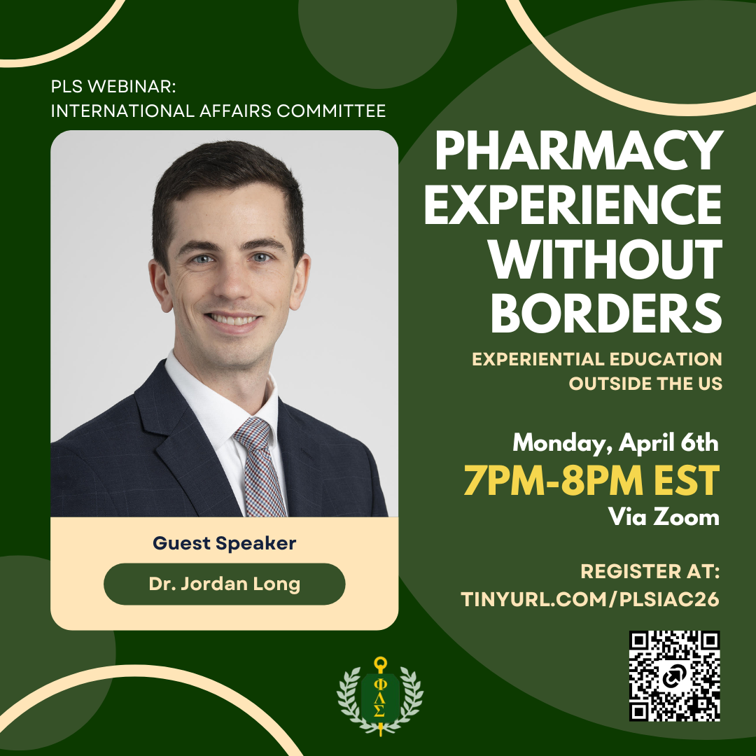 The PLS IAC Committee presents: Pharmacy Experience Without Borders: Experiential Education Outside the US! Register to attend on April 6th at 7 PM EST at https://us02web.zoom.us/meeting/register/okFfDIWoSJ-hUIW6oO2OyA Please note the time correction! Jordan Long, PharmD, MBA, MS, BCPS, currently ...Read more